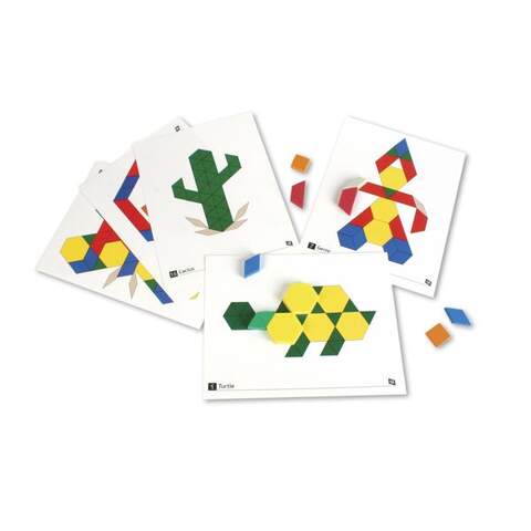 Set of 20 full colour exploration cards for use with pattern blocks. Each card contains a picture to be reproduced using blocks and is labelled as an object, animal, fruit, etc. These can be used to aid in teaching how different shapes, when used together, can create geometric shapes and patterns.